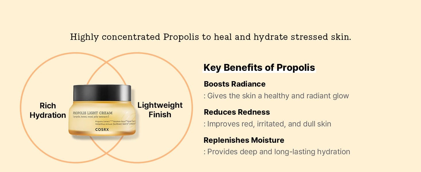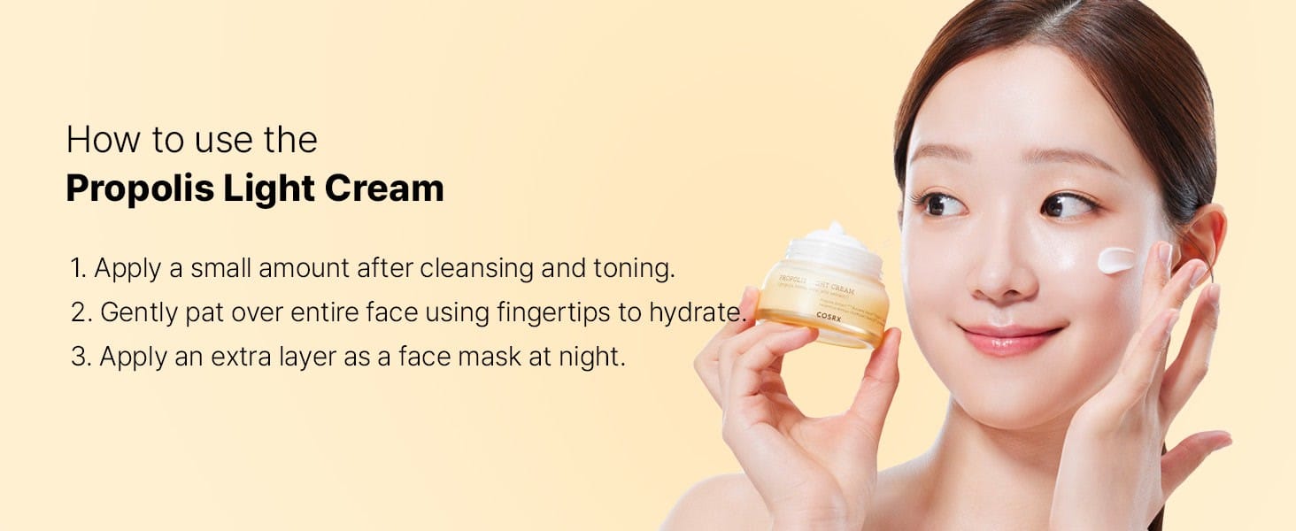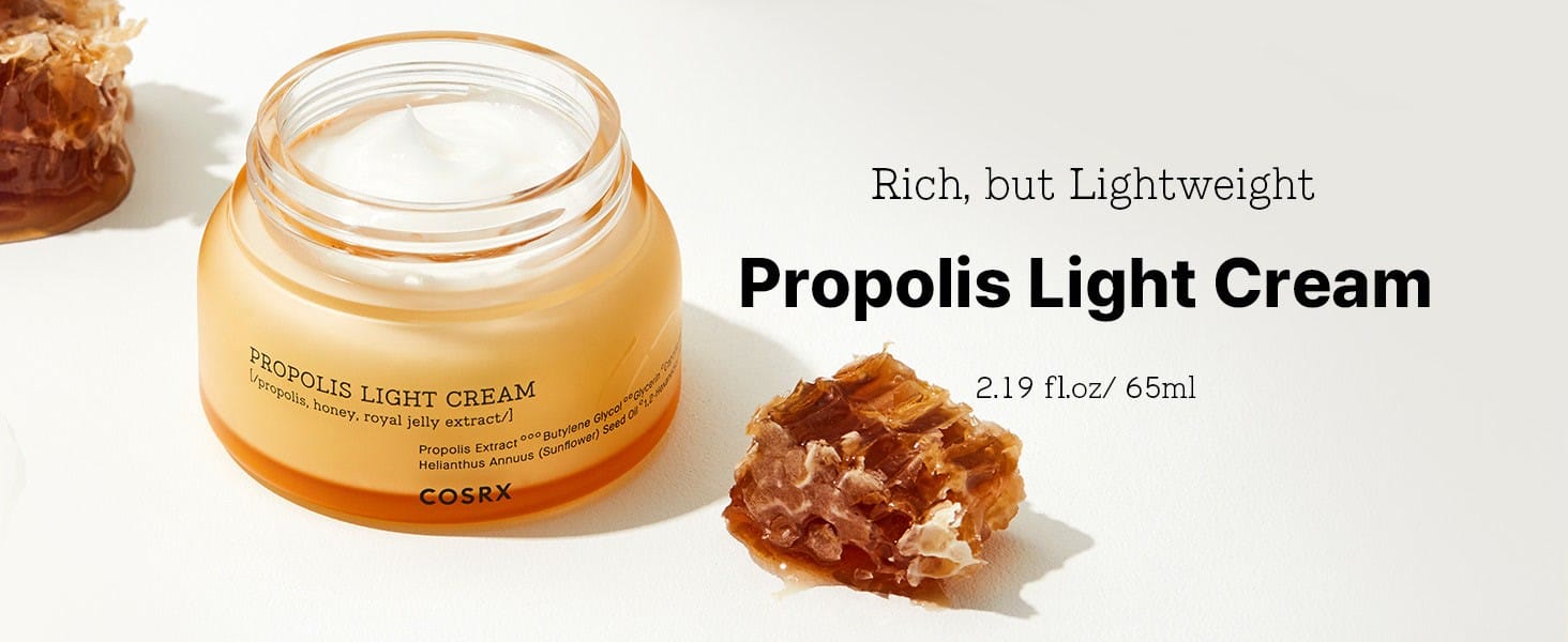 Cosrx – Propolis Light Cream este o cremă lejeră formulată cu 65,5% extract de propolis de la albini negre, cunoscut pentru proprietățile sale antioxidante, antiinflamatoare și antibacteriene. Această cremă intens hidratantă conține extract de miere pentru o hidratare profundă și nu lasă senzație de grăsime pe piele. Hipoalergenică, testată dermatologic și netestată pe animale, crema este ideală pentru toate tipurile de ten, inclusiv cel sensibil.