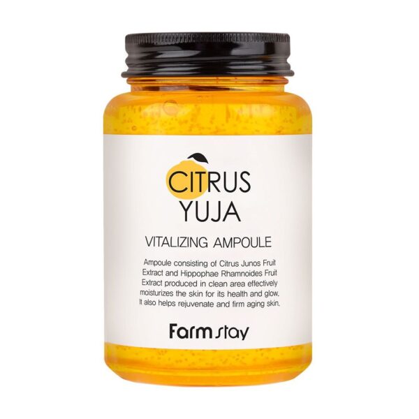 Farmstay โ Citrus Yuja Vitalizing Ampoule, 250ml este un tratament concentrat cu efect iluminator ศi revitalizant, formulat pentru a reda luminozitatea naturalฤ a pielii ศi pentru a uniformiza tonul. Extractul de Yuja, bogat รฎn vitamina C, oferฤ un boost de energie ศi prospeศime, ajutรขnd la estomparea petelor ศi la รฎmbunฤtฤศirea texturii tenului. Formula intens hidratantฤ lasฤ pielea netedฤ, luminoasฤ ศi revitalizatฤ.