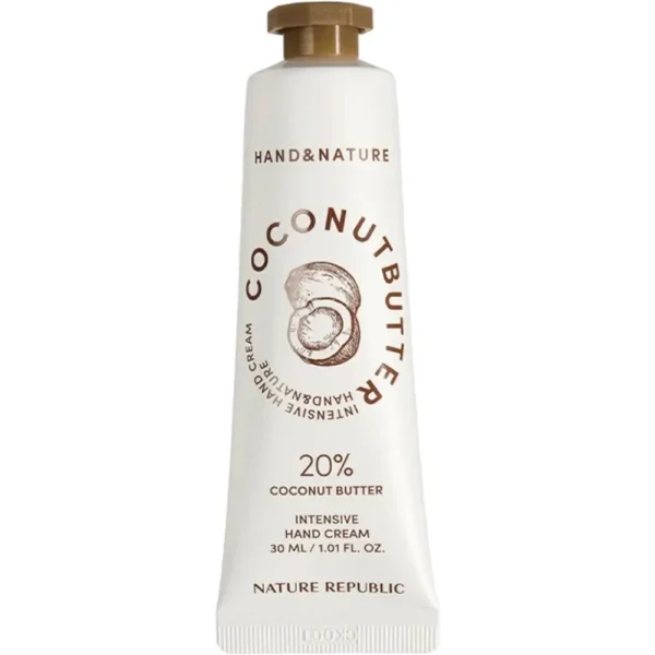 Nature Republic โ Hand & Nature Coconut Butter Intensive Hand Cream โ 30ml este o cremฤ de mรขini intens nutritivฤ, formulatฤ cu unt de cocos, conceputฤ pentru a hidrata รฎn profunzime ศi a repara pielea uscatฤ ศi deterioratฤ. Aceasta ajutฤ la refacerea barierei de protecศie a pielii, lฤsรขnd mรขinile moi, catifelate ศi protejate รฎmpotriva deshidratฤrii.