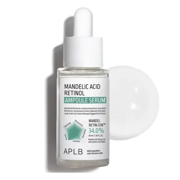 Serul APLB Mandelic Acid Retinol Ampoule oferă o combinație puternică de exfoliere delicată și beneficii anti-îmbătrânire pentru un ten vizibil mai neted și mai luminos.