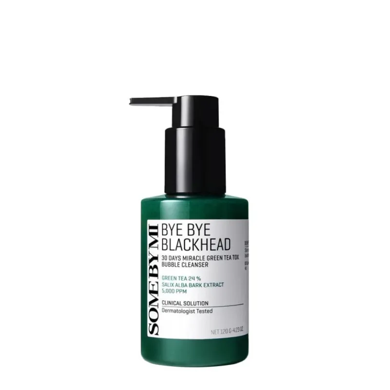 SOME BY MI โ Bye Bye Blackhead 30 Days Miracle Green Tea Tox Bubble Cleanser, 120g este un gel de curฤศare inovator, creat pentru a elimina eficient punctele negre ศi pentru a purifica porii. Formula sa se transformฤ รฎntr-o spumฤ delicatฤ la contactul cu pielea, curฤศรขnd impuritฤศile ศi excesul de sebum รฎn profunzime. Cu 240.000 ppm apฤ de ceai verde ศi un complex de 16 extracte de ceai, produsul oferฤ o curฤศare blรขndฤ, dar intensฤ, conferind pielii un aspect curat, luminos ศi neted.