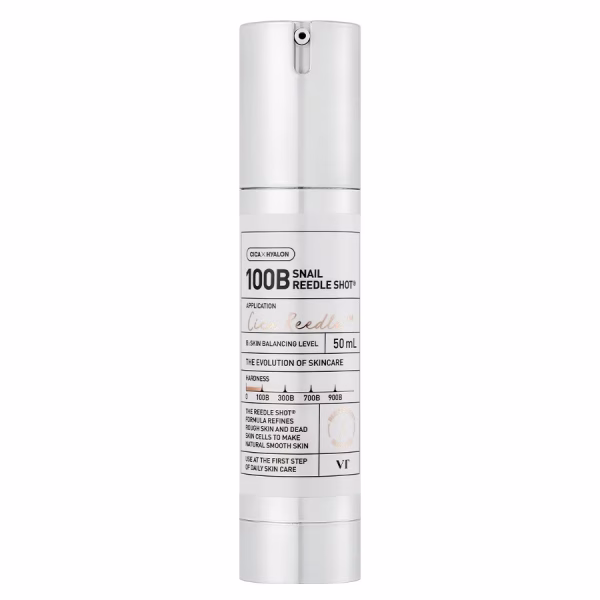 VT Cosmetics – Snail Reedle Shot 100B, 50ml este un ser concentrat cu extract de melc, formulat pentru a oferi hidratare intensฤ, calmare ศi regenerare pielii. Ingredientul de bazฤ, mucina de melc, este cunoscut pentru proprietฤศile sale nutritive ศi de susศinere a proceselor naturale de refacere ale pielii, contribuind la netezirea texturii, hidratarea de duratฤ ศi un aspect mai sฤnฤtos ศi revitalizat al tenului. Textura sa lejerฤ se absoarbe rapid, fฤrฤ senzaศie de รฎncฤrcare, fiind idealฤ pentru rutina de รฎngrijire zilnicฤ.